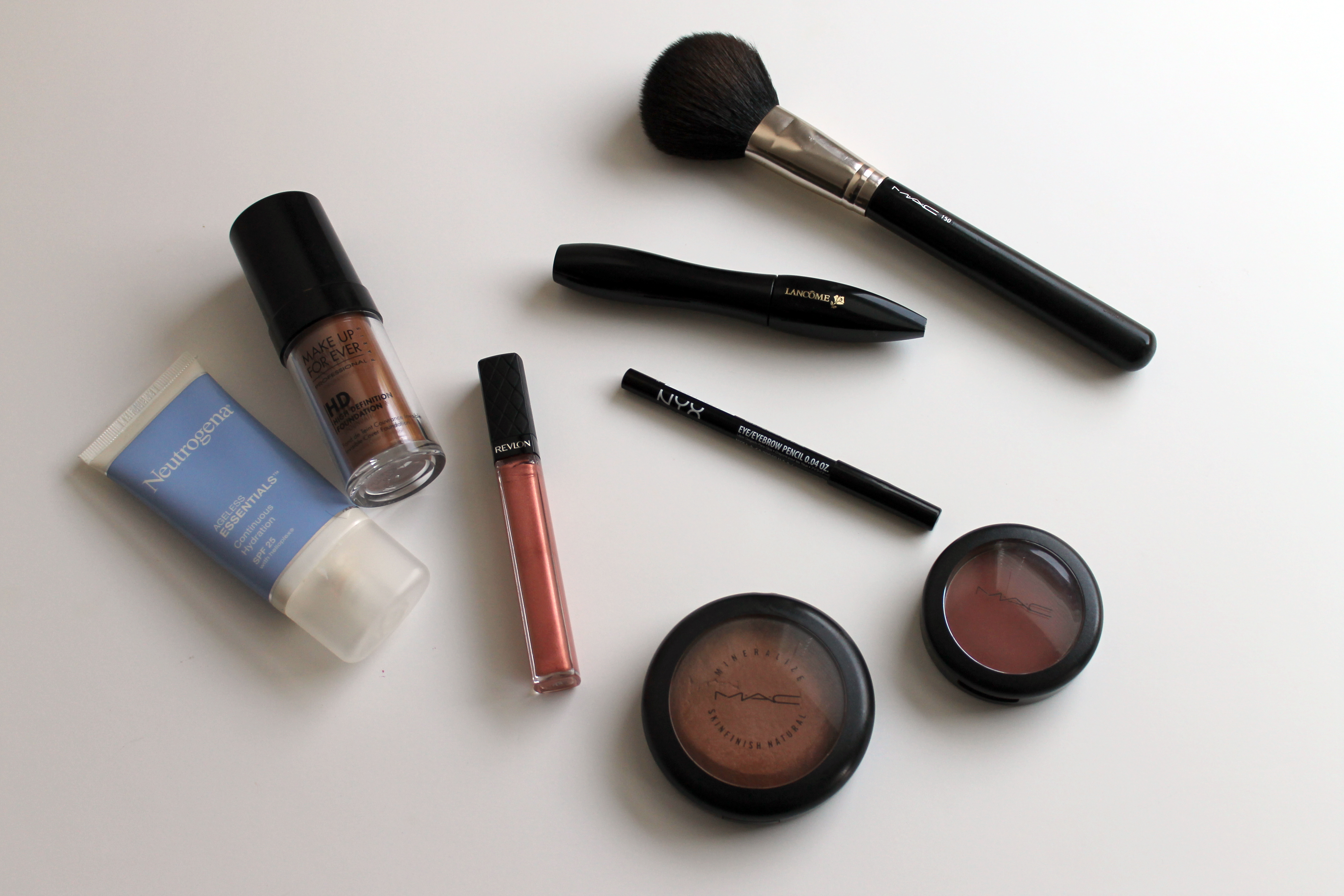 Moisturizer, HD Makeup Forever Liquid Foundation, NYX Eye & Brow Pencil, Mac Skinfinish, Mac Blush, Lancome Hypnose Mascara, Revlon Lip Gloss, Mac Powder Brush