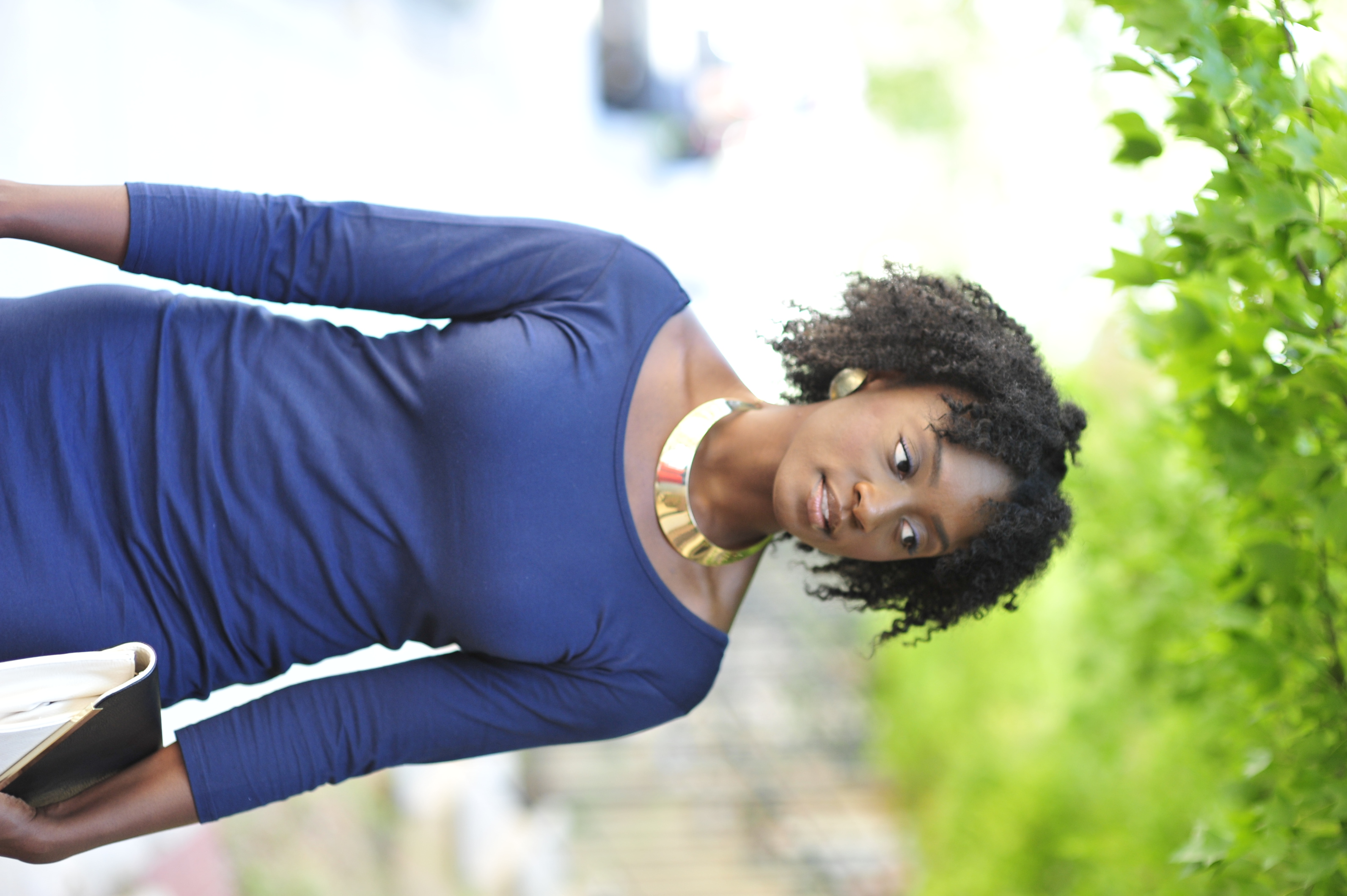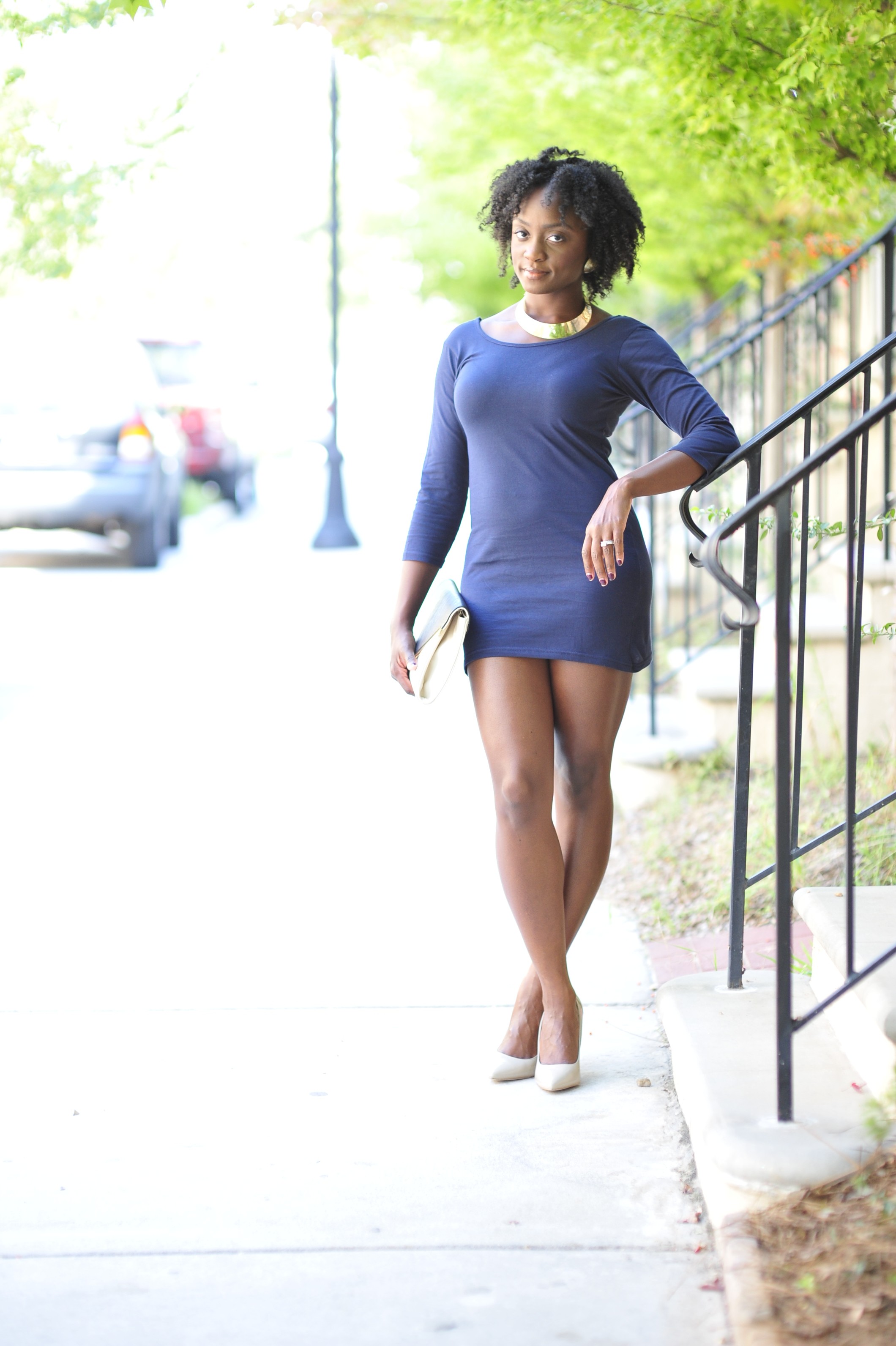 What I’m Wearing: Navy Bodycon Dress (Gifted), F21 Envelope Clutch, Express Gold Collar Necklace, Steve Madden Pumps
