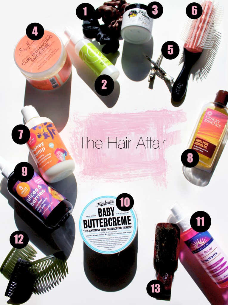 The Products: I do not like to spend hours on end in a bathroom mirror doing my hair. Matter of fact: if I could wake up gorgeous, that would be ideal! {giggle} Nevertheless, I’ve tailored my routine to simple steps with certain products to help me maintain my curly coif. Above you will find 13 items that helps me get it moisturized, get it tamed, get it oiled, but mostly…GET IT TOGETHER! I have numbered them to make it very easy for you to relate.