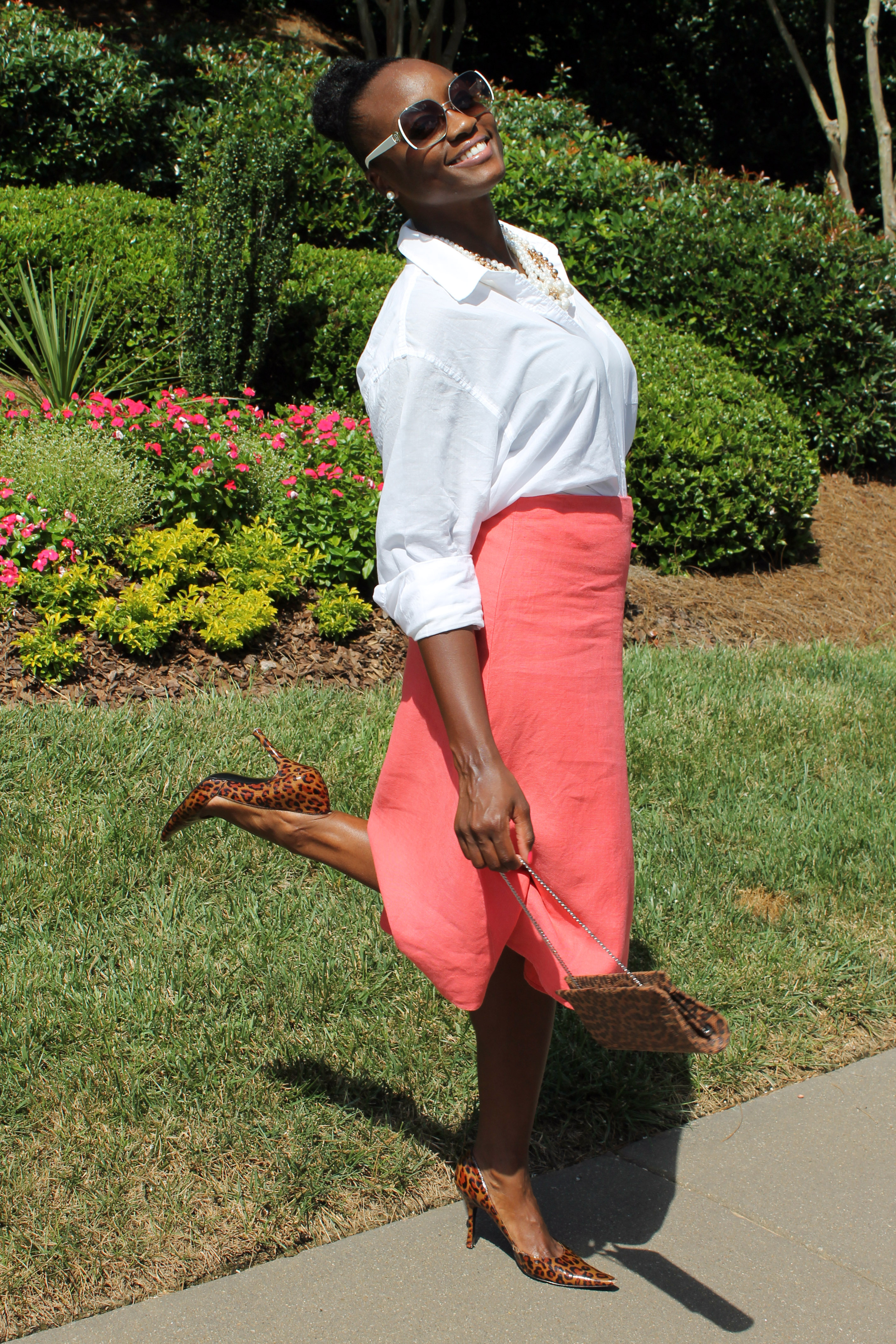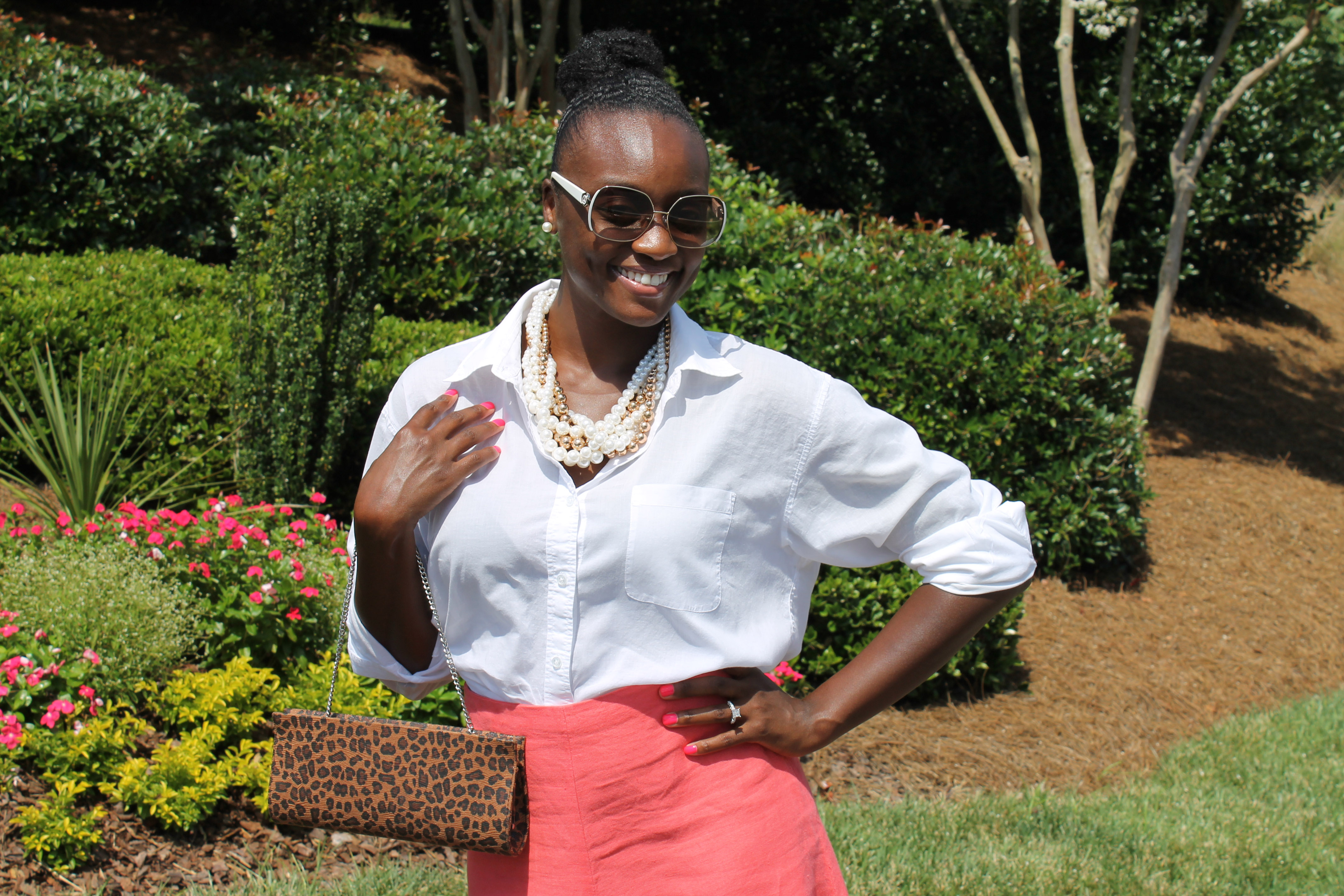 Express Boyfriend Shirt, Banana Republic Linen Skirt & Leopard Clutch, Juicy Couture Shades, H&M Bauble Necklace, BCBG Leopard Pumps