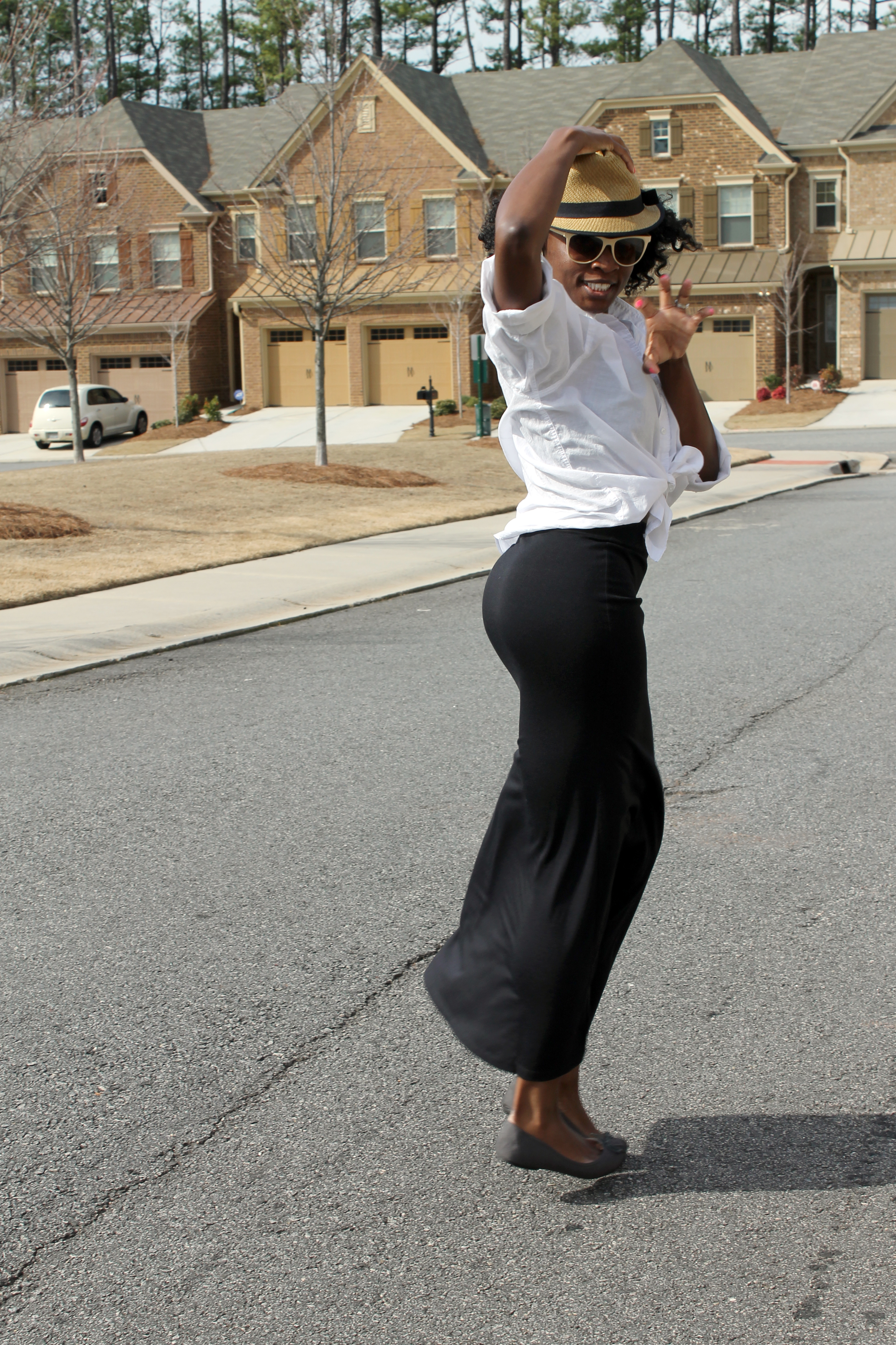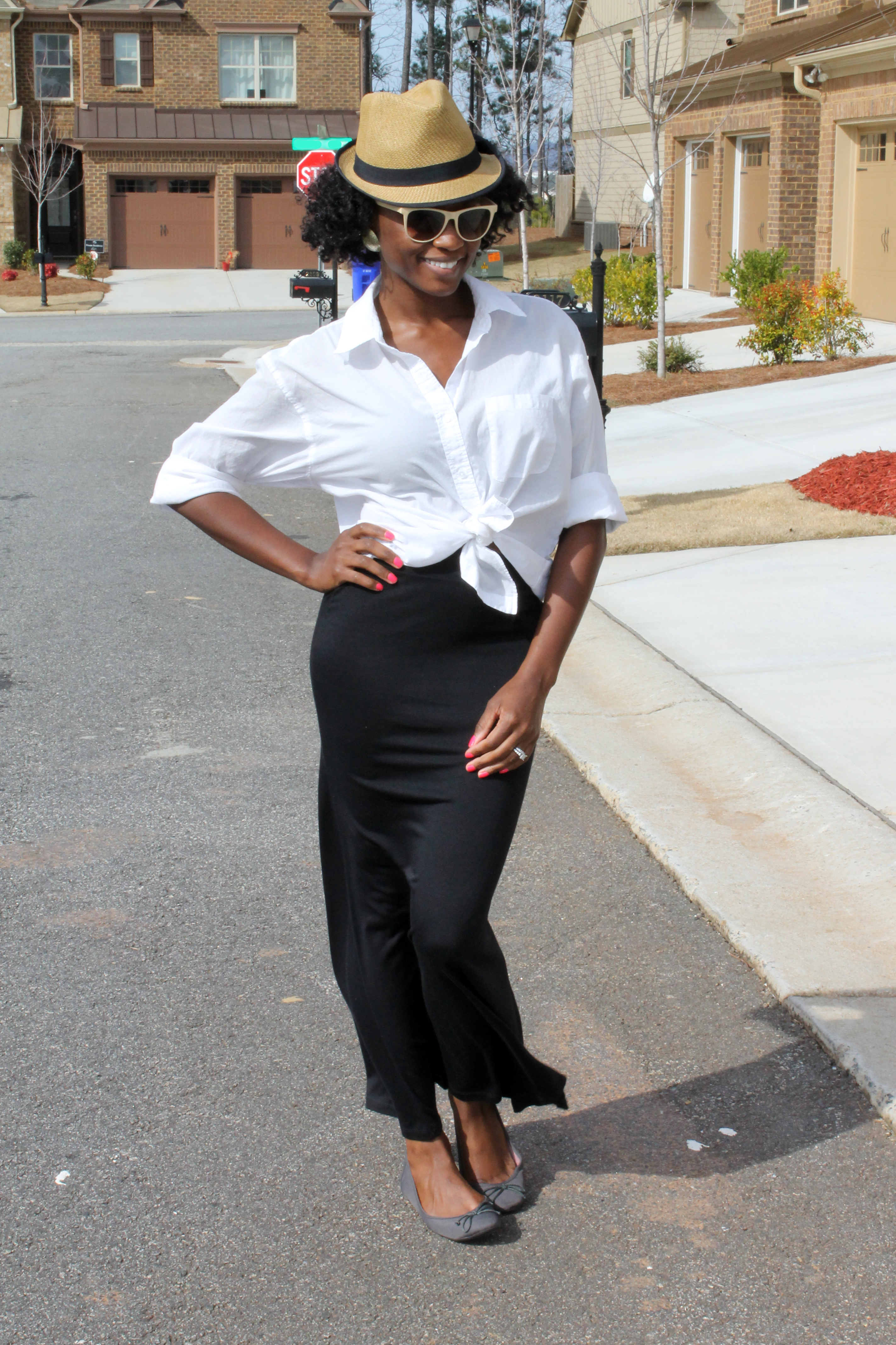Express Boyfriend Shirt, Urban Outfitters Maxi Skirt & Hat, Forever 21 Cat Eye Sunglasses, Zara flats, Bill Hallman Earrings