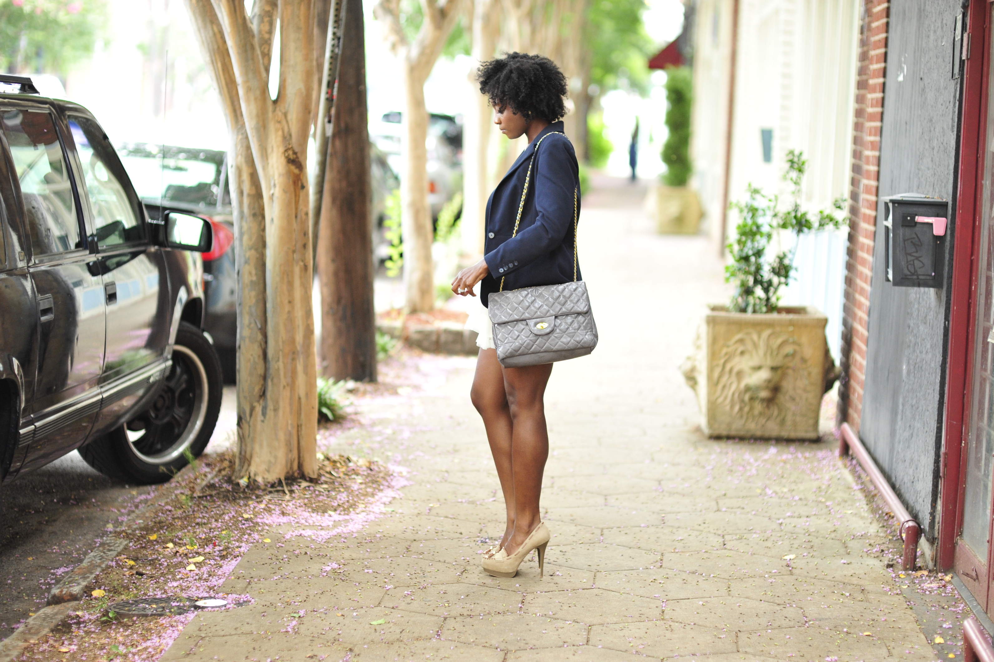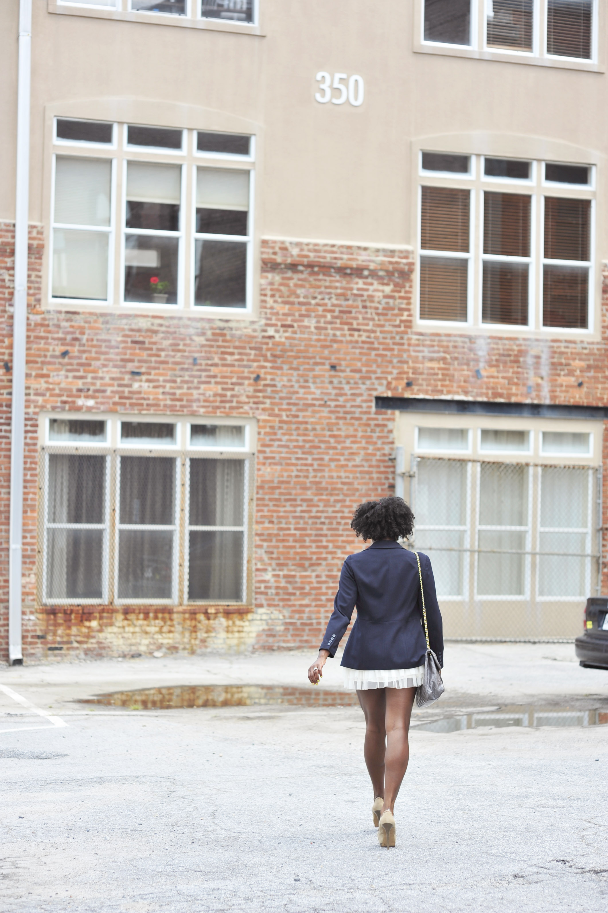 Vintage Navy Blazer, F21 Tutu Skirt, Thrifted Top, Jessica Simpson Moccasin Pumps, K-La Quilted Bag, Bill Hallman Earrings